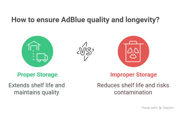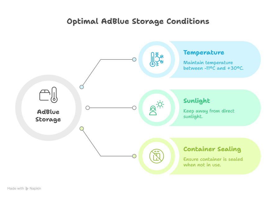 AdBlue should be stored in a cool, dry, and ventilated area away from direct sunlight. The optimal storage temperature is between -11°C and +30°C. Always keep the container sealed when not in use.