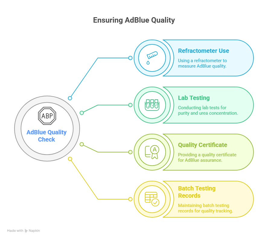 You can check AdBlue quality using a refractometer or by verifying its purity and urea concentration through lab testing. Our AdBlue comes with a quality certificate and batch testing records.