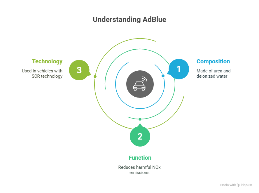 AdBlue, also known as Diesel Exhaust Fluid (DEF), is a non-toxic solution made of urea and deionized water. It is used in diesel vehicles with SCR (Selective Catalytic Reduction) technology to reduce harmful NOx emissions.